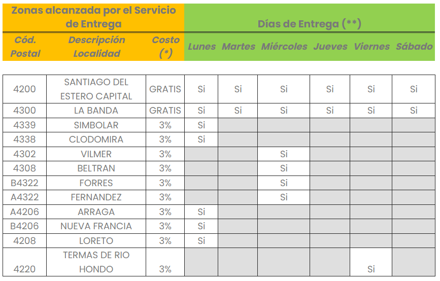 En la siguiente tabla se definen las zonas alcanzadas por el servicio de entrega, los días habilitados y los costos que se aplican